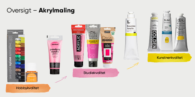 Hobbykvalitet – lavere kvalitet, der er velegnet til hobbyprojekter og til begyndere, der vil prøve at male med akrylmaling.
