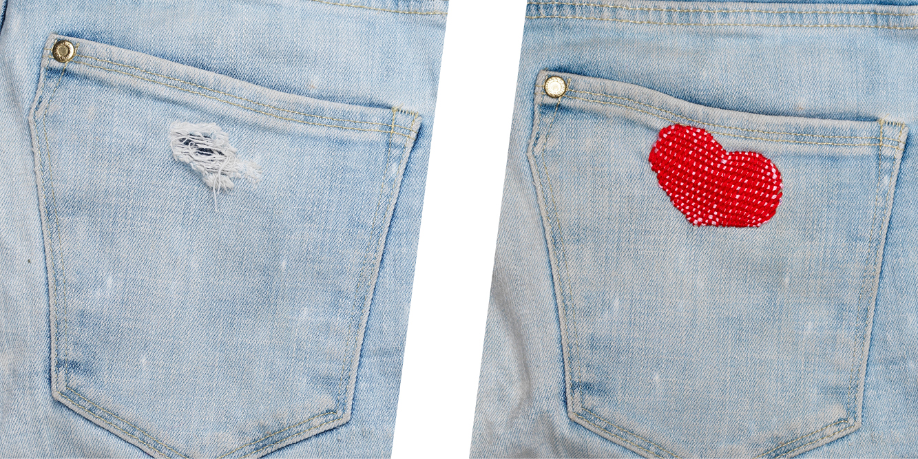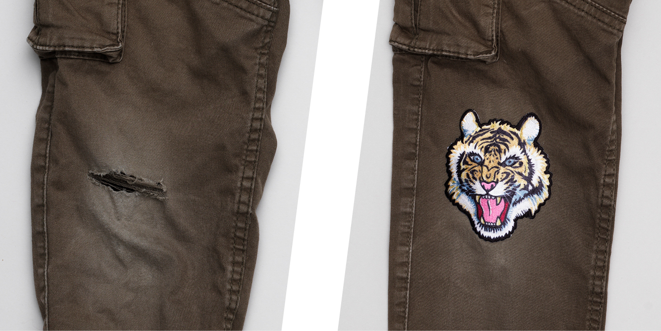 Mindre huller kan let dækkes med broderi eller en iron-on. Skal du reparere et større hul, er det bedst med en lap. Du kan også kombinere de to; reparér først og sy en lap på bagefter.