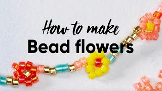 Lav en blomst: Træk 5 perler på til blomsterblade og 1 perle i en anden farve til støvdrager. Træk perlenålen igennem den første perle i blomsterbladskæden. Hold på perlerne, så de ligger tæt sammen med de foregående perler. Træk yderligere 3 perler på til blomsterblade, og træk nålen gennem perlen før støvdrageren. Hold på perlerne, så de ligger tæt sammen, når du trækker nålen igennem.
