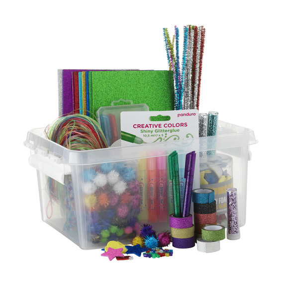 801889https://panduro.com/da-dk/products/born-junior/diy-kit/materialeasker/hobbykasse-mega-glitter-kit-801889Hobbykasse Mega Glitter kithttps://panduro.com/ArticleImages/565x565/801889_01.jpg299,95299,95DKKInStockPanduro Hobby/80/8010/801025Mega Fun Glitter Kit, til den der bare elsker alt, der glitrer og skinner, hvad enten det er pakker, kort, tegninger eller DIY-projekter. Her kommer en stor æske fyldt med alt, hvad du skal bruge for at glitre. <ul><li>5 st. glitterlim a 10,5 ml (gul, orange, rosa, grøn og blå) samt 6 glitterpenne (guld, bronze, lilla, blå, grøn og rød)</li><li>9 stk. glitrende dekorationsgummi a 20x15 cm.</li><li>Masser af forskelligtfarvede glitrende pomponer, piberensere, glitrende Hama-perler og en glitrende funky foam (hjerter og stjerner)</li><li>10 stk. glittertape a 2 meter med 15 mm bredde og 3 stk. rør med glitter (cerise, blå og sølv)</li><li>1 stk. pose Filofun fletsnor. 80 stk. a 50 cm. Som naturligvis glitrer!</li>In Stock