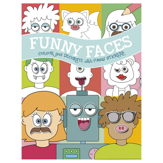 Malebog Funny Faces, 21,5x28 cm. Mal og dekorer figurerne med sjove stickers. 32 sider + 4 sider stickers. Fra 3 år.