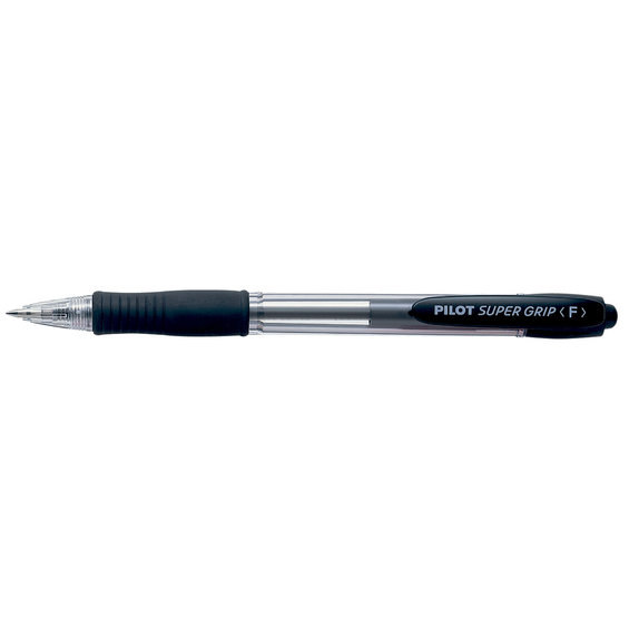 PILOT Super Grip, genopfyldelig kuglepen med klikmekanisme. Pennen er utrolig behagelig at skrive med pga. det lækre greb og det oliebaserede og dokumentægte blæk, som glider let over papiret. Den robuste tungstenskugle er slidstærk og bevarer formen over tid. Kuglepennen har gennemsigtig krop, så du kan se, hvornår det er på tide at skifte patron. Pris pr. stk. Fine; sort - skrivebredde 0,22 mm.