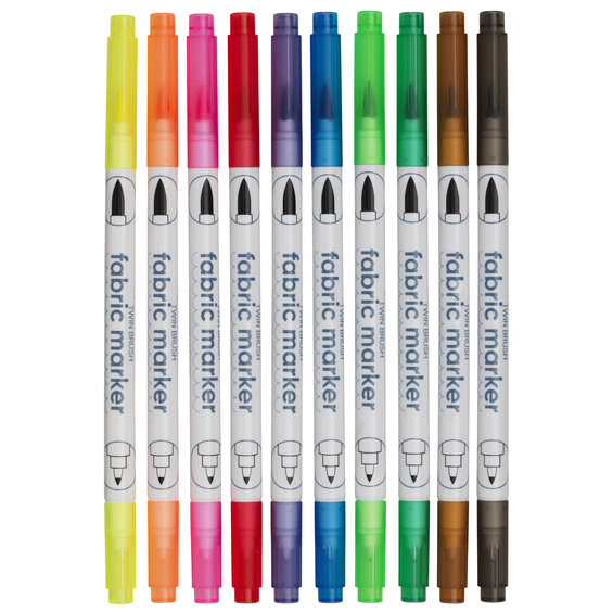 Twin Brush tekstilpenne, med 2 spidser: penselspids og fine tip 0,5 mm. Til lyse, forvaskede stoffer af bomuld eller bomuldsblanding. Stoffet skal være tørt før maling. Lad det malede tøj tørre på et plant underlag i ca. 24 timer. Kræver ikke fiksering. Tåler maskinvask ved 40°C. Farver: Gul, orange, rosa, rød, lilla, blå, lysegrøn, mørkegrøn, brun og sort. Pakke med 10 stk.