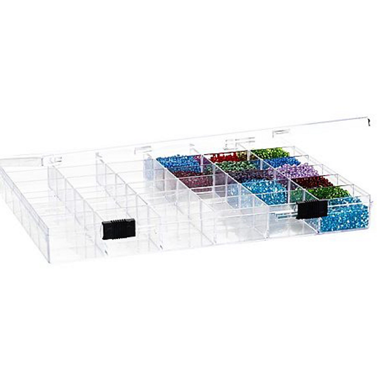 Opbevaringsæske 36 rum, (40x30 mm) af plast. 24x18 cm, højde 3 cm. Til smykkedele, perler, knapper m.m.