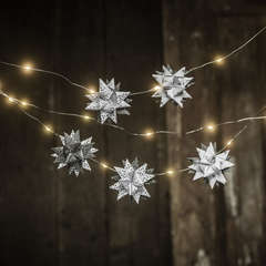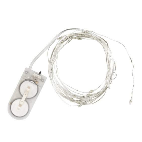 LED-lyskæde Confetti, med 30 pærer. Lyskæden er velegnet til mindre dekorationer, borddekorationer, blomsterarrangementer o.l. Batteridrevet: 2 x CR2032 litiumbatterier. Inkl. batterier. Kun beregnet til indendørsbrug. Sølv; 300 + 30 cm.