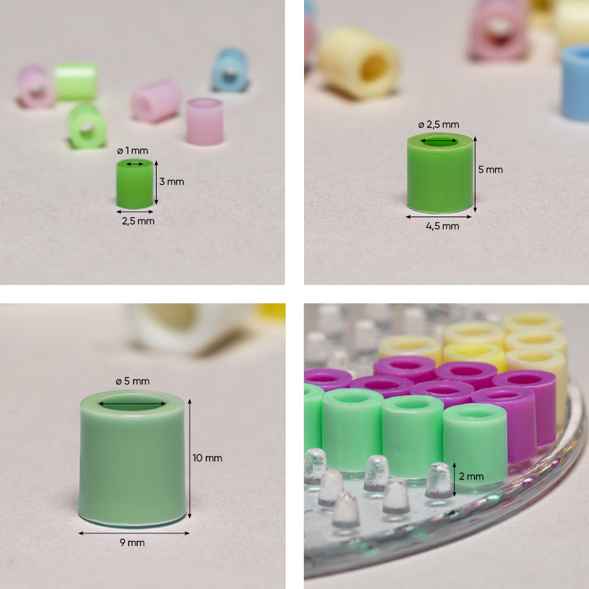 Helmialustojen piikit ovat lyhyehköt, jotta voit painaa helmiä helpommin silittäessäsi ilman, että levyt menevät rikki. Medium-helmille tarkoitetun helmialustan piikkien korkeus on noin 2 mm.