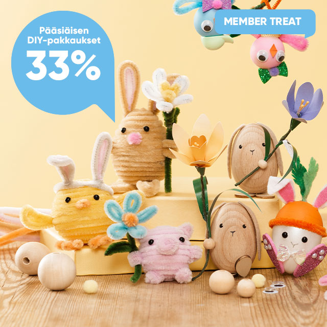 Pandurolle pääsiäinen tarkoittaa luovaa aikaa yhdessä. Viihtyisä juhla, joka sopii täydellisesti pääsiäispuuhasteluun, munajahdin järjestämiseen ja kevään toivottamiseen tervetulleeksi kauniilla pääsiäiskattauksella! Laajaan pääsiäisvalikoimaamme olemme koonneet runsaasti pääsiäisaskarteluja lapsille ja aikuisille, munia kaikissa materiaaleissa ja muodoissa, värikkäitä höyheniä, satiininauhoja ja kaikkea muuta, mitä tarvitset itsetehtyjen pääsiäiskoristeiden luomiseen. Meillä on tietysti myös paljon pääsiäismunia, jotka pääsiäispupu voi täyttää pääsiäiskarkeilla tai pienillä pääsiäisyllätyksillä, sekä vinkkejä luoviin pääsiäislahjoihin. Luovasta pääsiäismaailmastamme löydät kaiken aina pääsiäisinspiraatiosta munien väreihin ja maaleihin!