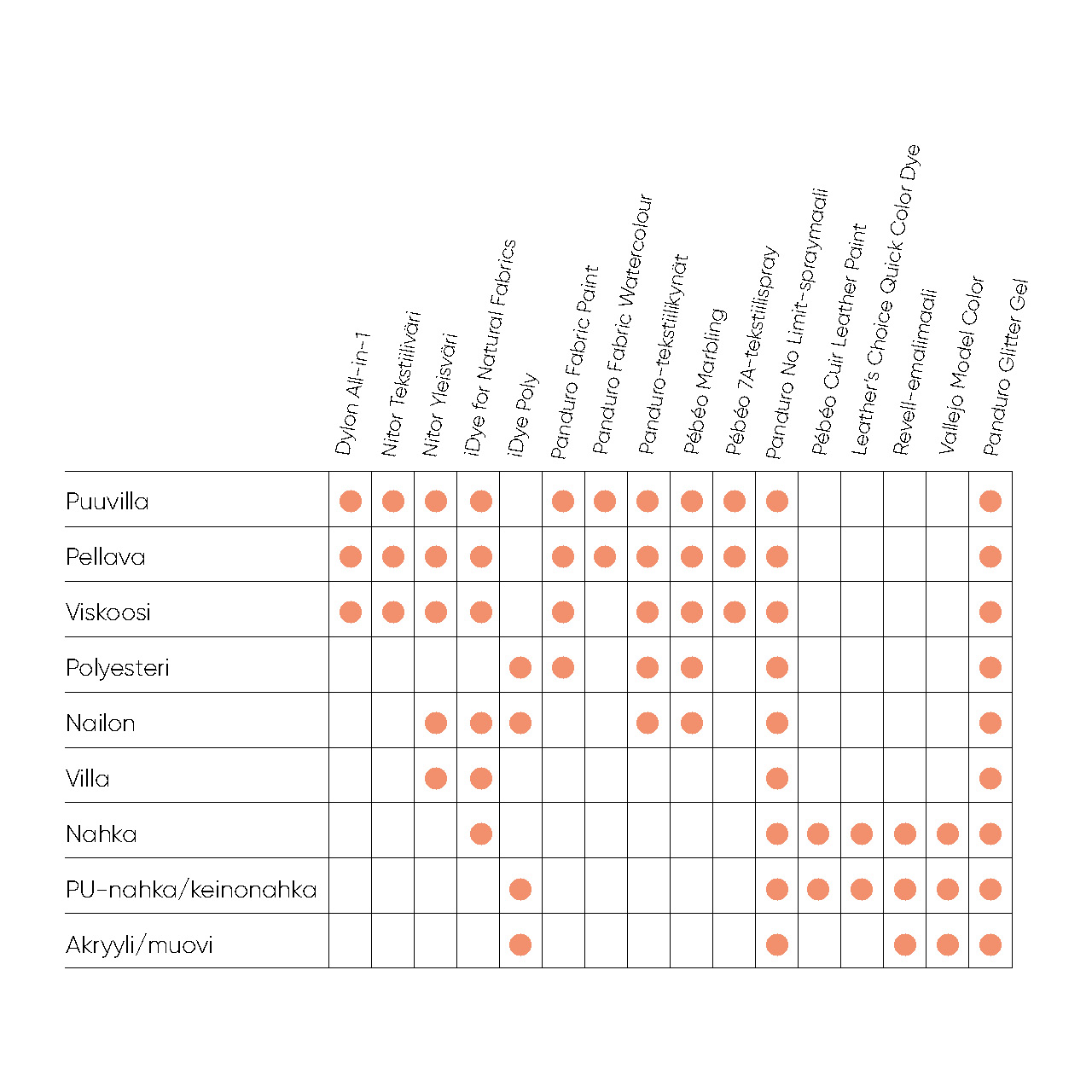 Nahalle, tekonahalle ja purjekankaalle tarkoitettu maali ei sovellu mokalle tai vastaaville materiaaleille. Puhdista alusta ennen maalaamista. Käsittele pinta nahkarasvalla kenkien maalaamisen jälkeen.