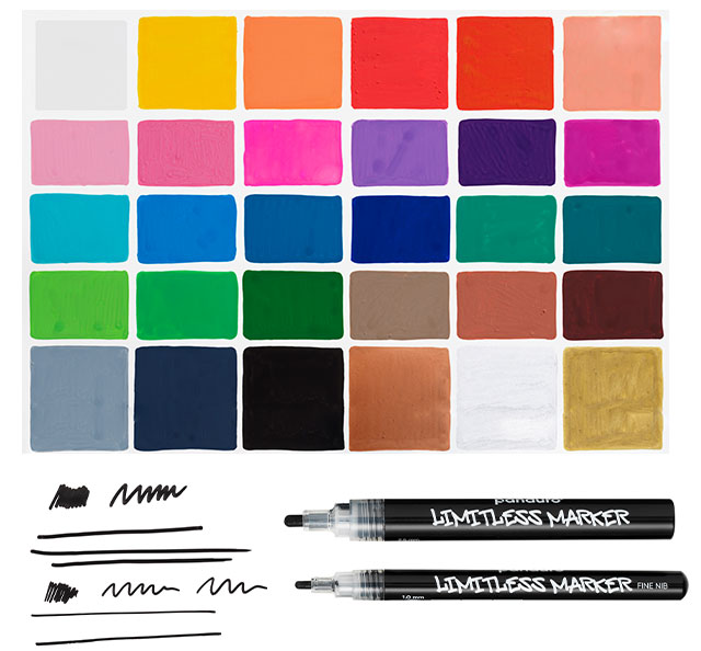 Limitless Markers är Panduros egna vattenbaserade akrylmarkers som gör det enkelt (och riktigt kul!) att skapa färgstarka projekt på nästan vilken yta som helst. Med sin täckande, pigmentrika färg kan du måla gult på svart, rosa på blått och bygga lager på lager utan att färgerna försvinner. Perfekt både för dig som älskar att illustrera och för dig som bara vill pyssla loss hemma vid köksbordet.