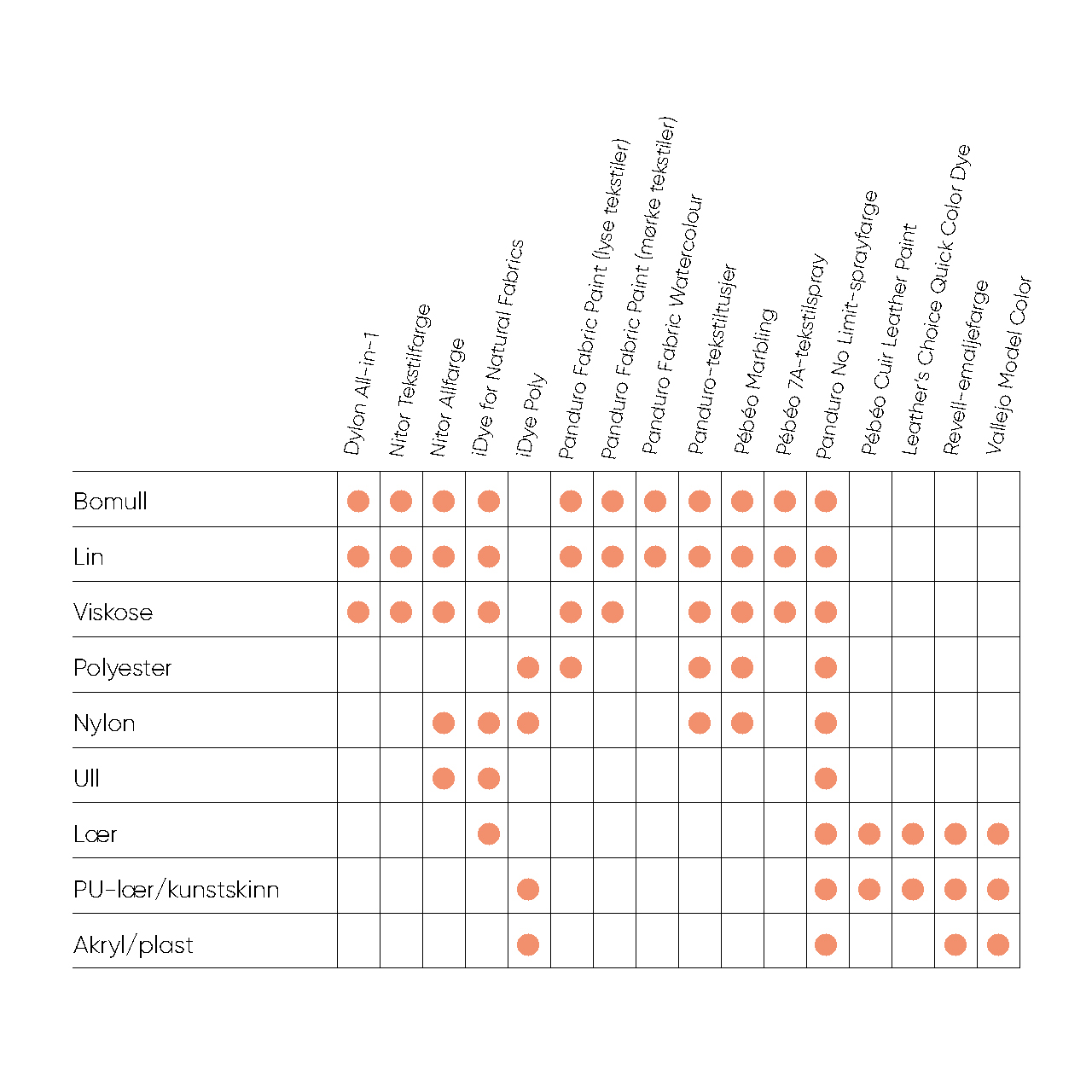 Farge til lær, skinn, syntetisk lær og seilduk, fungerer ikke på semsket skinn eller lignende materialer. Rengjør underlaget før maling. Behandle med skinnfett etter farging av sko.