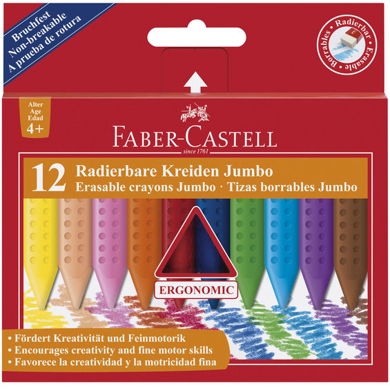 Utviskbare Jumbo kritt 12-pk, barnekritt fra Faber-Castell med Soft-Grip-Zone som gir et stødig grep. Den ergonomiske designen gjør at det er lett for små hender å gripe rundt krittet, noe som gjør det lettere for barna å trylle fram fantastiske kunstverk. Fungerer både for venstre- og høyrehendte. Krittene varer dessuten ekstra lenge fordi de ikke knekker så lett som vanlige kritt. Pakken med 12 kritt i sterke og intensive farger. Egnet for barn fra 4 år. Farger: Gul, Beige, Rosa, Oransje, Rød, Mørkblå, Lysblå, Mørkgrønn, Lysgrønn, Lilla, Brun og Sort.