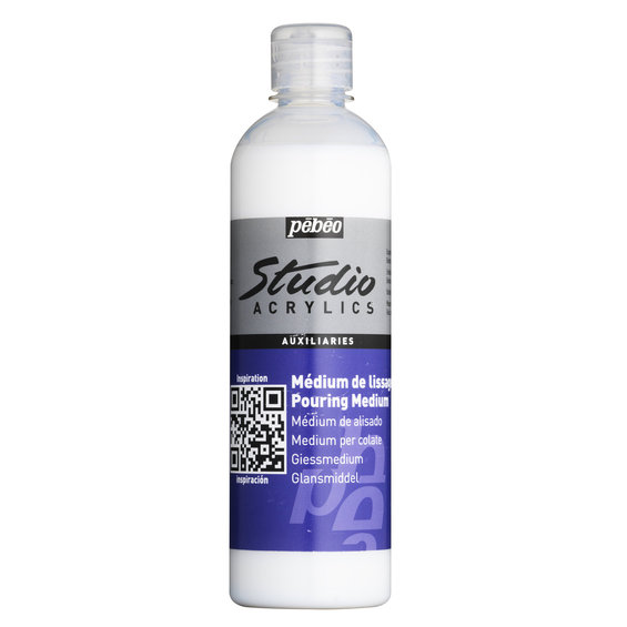 Pebeo pouring medium, lyst gjennomskinnelig malermedium som endrer akrylmalingens viskositet til mer lettflytende, jevn og holdbar. Glimrende for å skape myke overganger mellom farger, men også for å oppnå en dryppende, rennende eller annen utflytende effekt. Glimrende for teknikker som dirty pouring og acrylic pouring. En annen populær teknikk er å bruke silikonolje for å skape såkalte celleeffekter. Små mengder er tilstrekkelig for at fargen skal «skjære» seg, og det dannes da flotte mønstre med spennende fargeskiftninger. Gulner ikke. Kan også brukes som blank glanslakk.