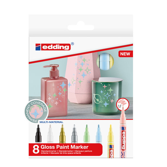 Edding Gloss Paint Marker 8-pk, høypigmentpenner med basis- metallic- og pastellfarger fra Edding, modell 751. Permanent merkepenn / marker med 1-2 mm skrivebredde som gir en hurtigtørkende opak lakkflate som gjør seg spesielt godt på materialer som glass, plast, metall og tre. Også mørke og transparente material går utmerket. Disse pennene er virkelig tøffe – det bestandige pigmentblekket tåler riper, lys og vann veldig godt – men også varme opp til 400 °C. Pennene har en ganske svak duft. Eddings pumpesystem betyr at pennene bør ristes før bruk, med korken på, og deretter fylles spissen ved å trykke den lett mot et kladdepapir et par ganger. Pakken inneholder følgende 8 farger: Hvit, sort, sølv, gull, pastellgrønn, pastellblå, pastellgul og pastellrosa.