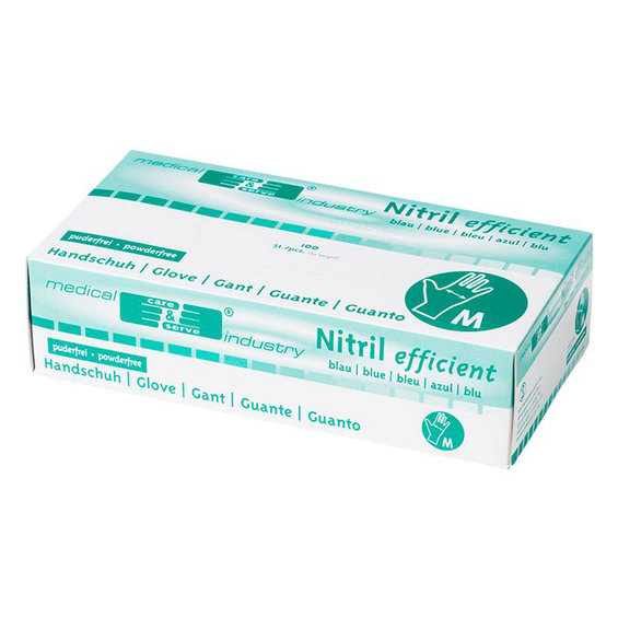 Blå pudderfrie beskyttelseshansker, som er pudderfrie og laget av nitril – altså helt uten lateks. Beskyttelseshanskene er næringsmiddelgodkjente og motstandsdyktige mot fett. De passer også til å beskytte hendene når man rydder og vasker pensker og lignende med sterke kjemikaler. Pakken inneholder 200 stk. hansker – dvs. 100 par.