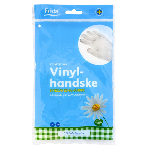 Vinylhansker 20-pakning, engangshansker med pudret innside. Pakken inneholder 20 hansker – totalt 10 par. God beskyttelse for hendene ved rengjøring, maling, husarbeid, hårfarging og annet arbeid der du kommer i kontakt med kjemikalier og lignende. Hanskene er dessuten næringsmiddelgodkjent. Fremstilt uten ftalater/mykgjørende stofferStørrelse medium.