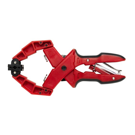 Klemme, av rød plast, bredde 21 cm (25 mm). Egnet til bokbinding, når du skal limes sammen din egen bok. Klem sammen boken med to klemmer mellom to MDF-plater når du arbeider.