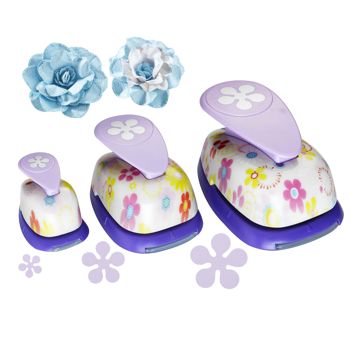 Figurstanser 3-pk, tre ulike størrelser: 5/8", 1.5", 2". Stansene fungerer både til tynt papir og kartong. Tips! Etter en stund kan stansen bli sløv. Stans da i en bit metallfolie, så blir den skarp igjen. Pakke med 3 stk.