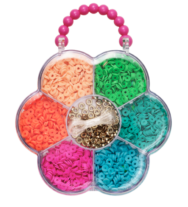 1100 heishi beads / heishi-pärlor à Ø6 mm i en liten blomformad väska i Panduro varumärke, art nr 804846.