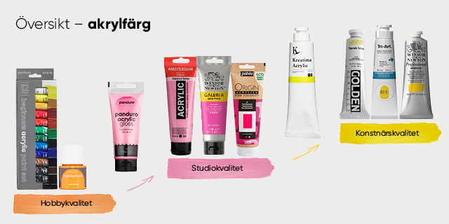 Hobbykvalitet – lägre kvalitet som passar bra till hobbyprojekt och till nybörjare som vill prova på att måla med akrylfärg.