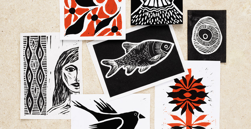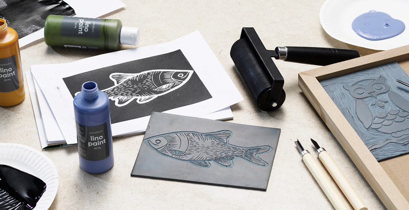 Linoleumsnitt är en grafisk teknik som går ut på att skära ut ett mönster i linoleum som du sen kan använda för att göra tryck på papper. Du kan trycka samma motiv flera gånger genom att återanvända samma linoleumplatta. Tänk bara på att diska rent plattan när du har tryckt färdigt. Du kan välja mellan att skära ut i Soft som är en mjukare linoleumplatta eller i Profi som är lite hårdare. Det du skär ut är det som kommer att bli ofärgat när du gör linoleumtrycket. Du kan också skära ut ett helt motiv, alltså skära ut bakgrunden, för att göra en typ av kliché att trycka med.