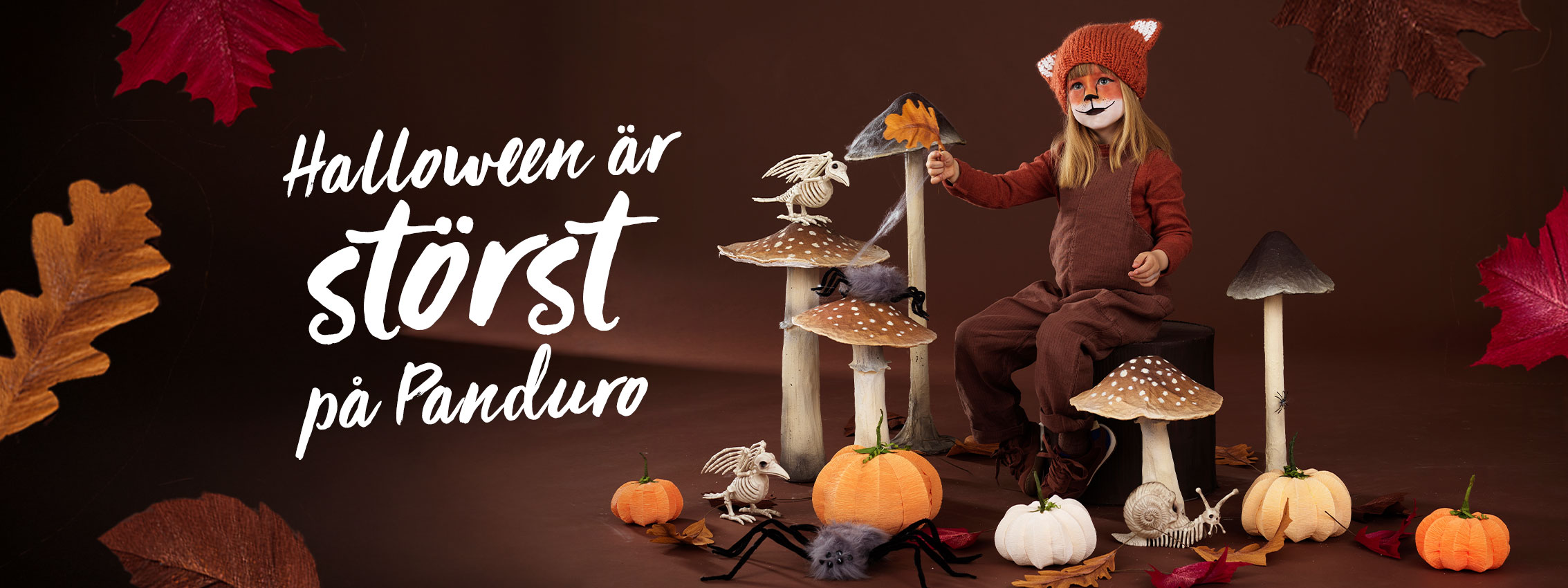 Vi på Panduro har samlat allt du behöver för att skapa en läskigt kul halloween för både barn och vuxna – oavsett om målet är att skrämma, underhålla eller bara locka fram skaparglädje och kreativitet. Vi har halloweenpyssel, DIY-kit, ansiktsfärg, linser och dekorationer så att du kan fixa den bästa halloweenfesten. Baka djävulska muffins, duka med rysliga dödskallar och halloweenpumpor, tillverka kusliga ljuslyktor och dekorationer, fixa halloweenlooken och viktigast av allt – sätt fart på barnens fantasi. Här finns även roliga halloweentips och inspirerande DIY-filmer som visar hur du kan sminka dig som vampyr eller göra spöken av gips. Ta en titt och låt spökfesten börja!