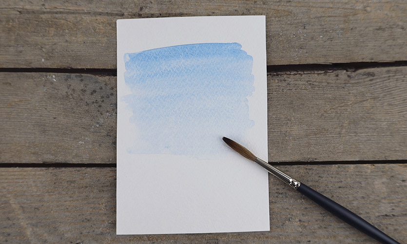 Hemligheten är, precis som med många andra akvarelltekniker, vatten. Förbered dig med färg och ett glas rent vatten, och luta din yta något så att färgen har möjlighet att rinna nedåt. Nu är det dags att börja måla på samma sätt som du gjorde när du fyllde hela din bakgrund – med horisontella streck där du laddar med färg vid varje ny rad. Skillnaden här kommer att vara att du börjar med att fukta din översta yta, och att du doppar din pensel i vatten efter att du har målat din första rad. Genom att du har mycket färg i början och späder din penselfärg mer och mer med vatten kommer du att få fram en fin graderad effekt som går från mörkt till ljust.