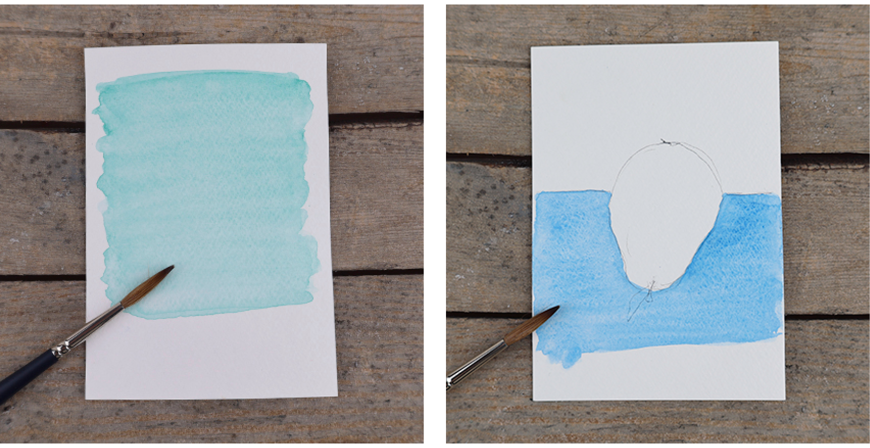 Ska du fylla ett helt ark med färg så är det lättaste sättet att arbeta streck för streck, uppifrån och ned. Vinkla din målaryta något (ca 30 grader) och håll även din pensel vinklad så att färgen enkelt kan rinna nedåt. Blanda fram den nyans du önskar – glöm inte att akvarellfärg blir aningen ljusare när den torkat – och måla horisontella streck med en akvarellpensel fylld med färg. När du nått kanten börjar du omedelbart om på raden under med ny färg, och ser till att din nya rad ”fäster” i färgen ovanför så att de tonar över i varandra och täcker ordentligt. Fortsätt fram till och med att hela pappret är täckt, torka av eventuell vätska som kan finnas längst ner på pappret och låt sedan din bakgrund torka innan du fortsätter med nästa motiv.