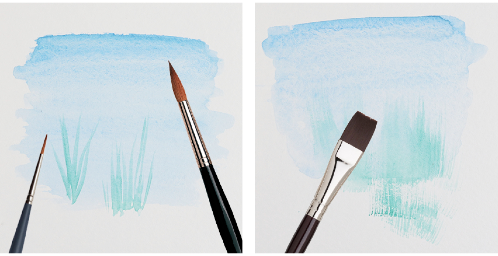 Målar du till exempelvis ett landskap med träd kommer du med all säkerhet både behöva använda olika penslar men även att hålla dina penslar på olika vis. Till din bakgrundsfärg kommer det kanske passa utmärkt att måla svepande drag med sidan på en rund pensel, men du kommer också att behöva hålla din detaljpensel närmare för att kunna måla mindre drag som kan bli trädgrenar. Med hjälp av din platta och fyrkantiga pensel kan du därefter måla och ”sprätta” med en nästintill torr pensel för att få fram ytterligare detaljer såsom grässtrån.