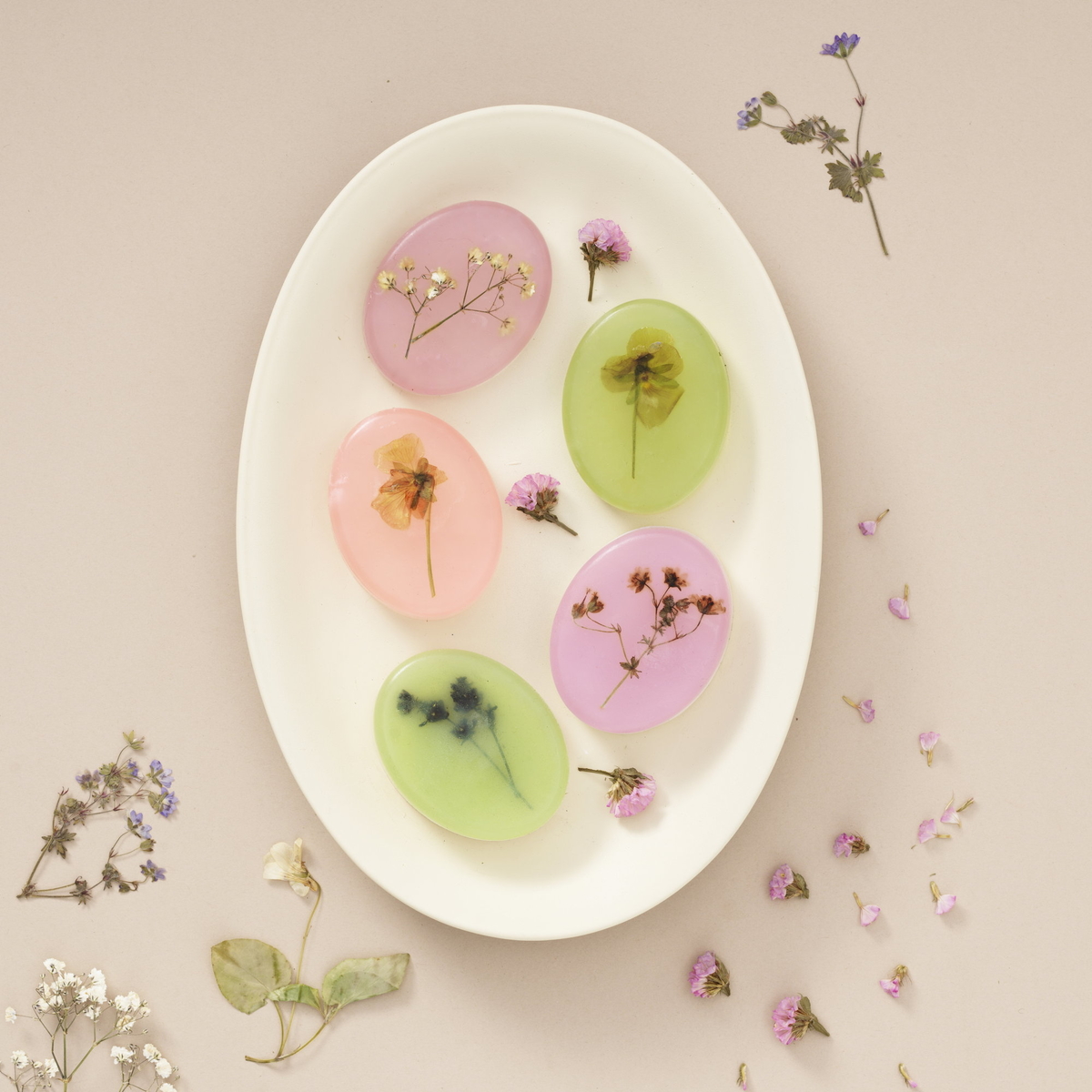 Gör sommarfina tvålar till badrummet som gör att det känns lite extra lyxigt att tvätta händerna! Vi har gjutit in pressade blommor i våra sommartvålar som extra piff. Tänk på att de här tvålarna är gjorda med torkade blommor enbart för utseendets skull och inte för att ge doft till tvålen. Om du vill att dina handgjorda tvålar ska lukta ljuvt av blommor kan du tillsätta tvåldoft.