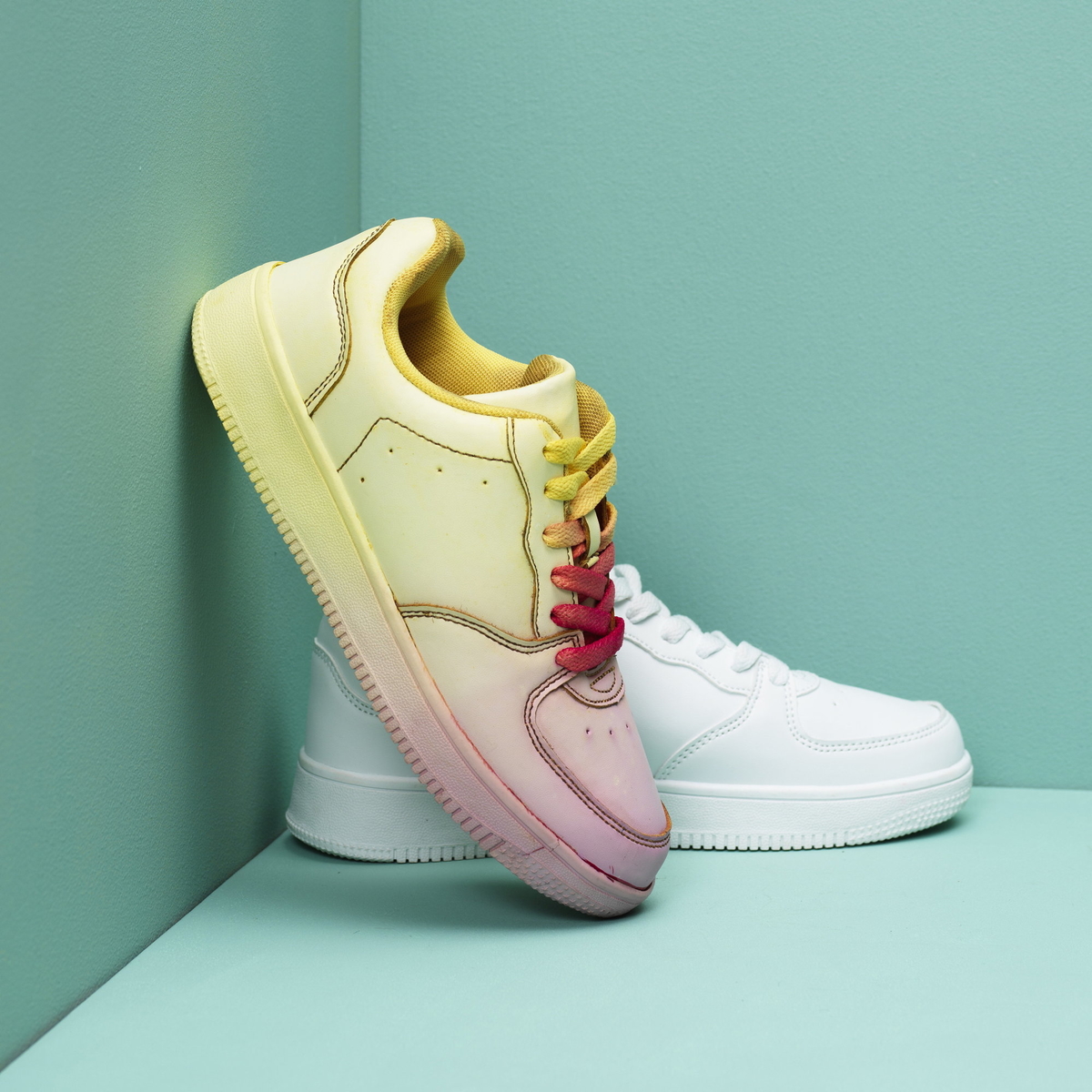 Har du tröttnat på dina skor, men är sugen på att ge dem en andra chans? Med iDye Poly kan du handfärga skor som är tillverkade av syntetiska material, till exempel PU-läder. Prova att skapa en snygg ombre-effekt genom att färga med två olika nyanser som här. Skosnörena är ofta tillverkade av bomull och kan färgas med Fabric Watercolour-textilfärg.