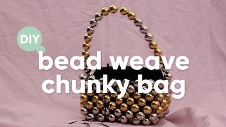 Med stora pärlor i skinande guld- och silvermetallic kan du göra en egen chunky partyväska! Du väver ihop pärlorna med en smycketråd av metall och sen kan du sy ett foder i vanligt bomullstyg om du vill. Du behöver 6 burkar med pärlor till en handväska enligt beskrivningen nedan.