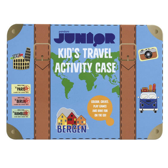 Kid's activity travel case, en nätt liten låda fylld med roliga saker för barn på resande fot som inte vill ha tråkigt på flygplatser / järnvägsstationer. Målarbok och 6 färgpennor för den som vill rita, lite pixlar och en pixelplatta för den som vill pixla. Vill du göra ett armband? Då finns det nylontråd samt sifferpärlor och pastellfärgade pärlor med i kitet. Vi har även lagt ner pyssel-klassiker som ett garnnystan och diverse piprensare. Det finns även ett bingo-spel + lite olika magneter så att ni kan spela tre i rad på lådans lock, fiffigt va?
