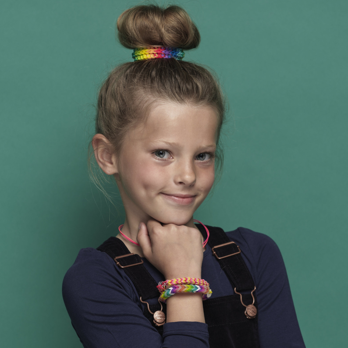 Rainbow Loom, för tillverkning av breda armband, ca 7–25 mm + figurer. Verktyg L. 26 cm, virknål, 600 gummiband i många olika färger, 24 clips och vägledning ingår. Från 8 år.