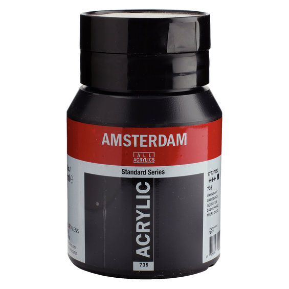 Opaciteten anges på följande vis: tom fyrkant = transparent / genomskinlig, tvärkorsad fyrkant = semitransparent / halvgenomskinlig, halvfylld fyrkant = semiopak /halvtäckande, fylld fyrkant = opak / täckande. Oxide Black 500 ml / OxidsvartAmsterdam