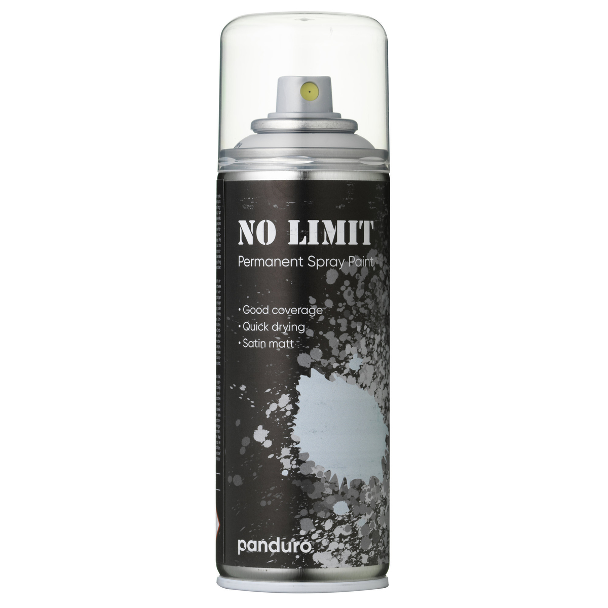 NO LIMIT sprayfärg, innehåll 200 ml (täcker ca 0,5-1 m²). Sidenmatt färg i hög kvalitet för både inom- och utomhusbruk. Snabbtorkande och permanent. Sprayfärgen ger en jämn fin yta, täcker mycket bra och fungerar på det mesta (ej styrolit eller silikon). Ytor av hårdplast ska först grundas, använd "No Limit primer plastic".