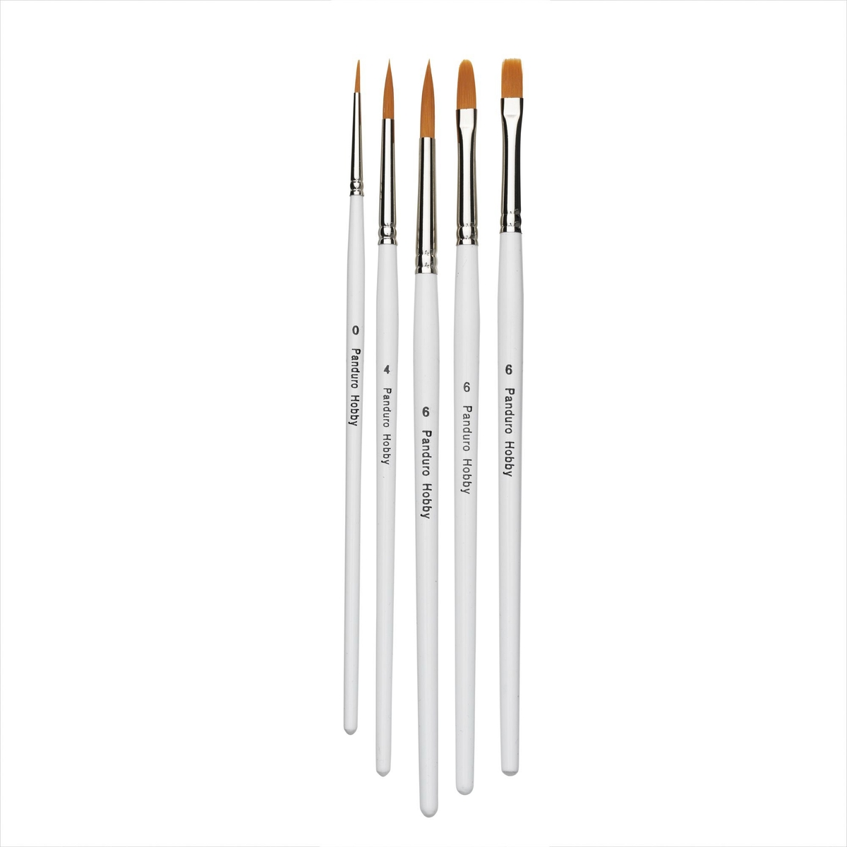 Penselsats mix, för hobbyfärg. Syntetborst. Rund nr 0, 4, 6, (1/2,5/3 mm), flat nr 6 och filbert nr 6 (5 mm). Träskaft 14 cm. Förpackning med 5 st.