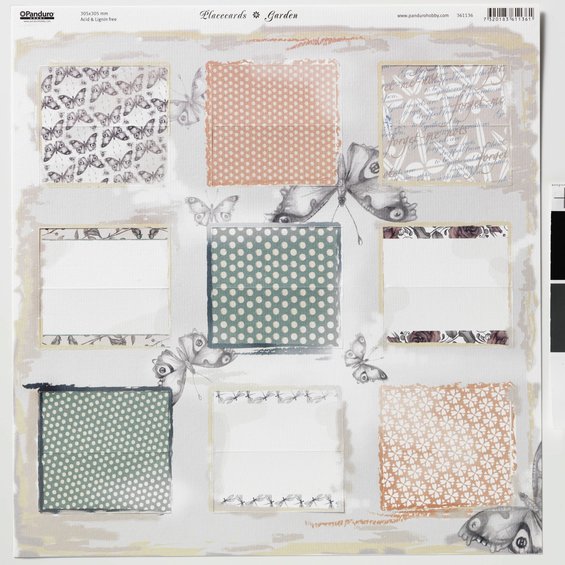 Placeringskort, 305x305 mm. Ytvikt 240 g. Korten är bigade och utstansade. Syra- och ligninfria. 1 ark med 9 kort.Garden.